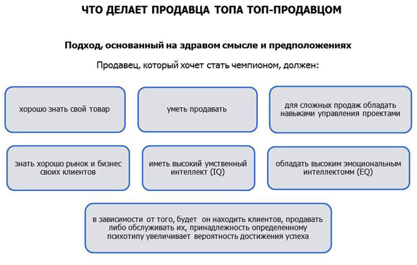 Оказывается, лучшие продавцы компаний не работают продавцами. Те, кто действительно понимает, что такое продажи, уже давно не продавцы. К чему спускаться в шахту и таскать вагонетки, если можно назваться стратегическим директором, вице-президентом или придумать какую-либо другую статусную приставку и почивать на лаврах? Но топы должны заниматься продажами.