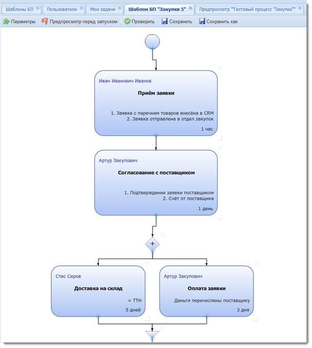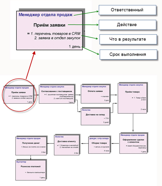 Менеджер по продажам выполнил свою задачу, кликнул в системе о выполнении своей задачи. Менеджер по закупкам уже знает, что пошло время на выполнение его задачи в рамках этого процесса. Закупщик выполнил задачу, кликнул - процесс перешёл к следующему сотруднику.