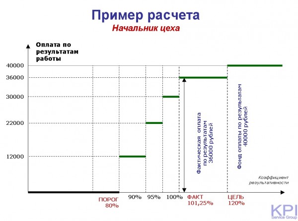 Если фактическое значение коэффициента результативности превышает порог, то оплата по результатам работы начисляется как доля от фонда PRP. Размер этой доли определяется величиной специального расчетного коэффициента. Расчетные коэффициенты подбираются экспертным путем в виде возрастающей («нижние ступеньки») или убывающей («верхние ступеньки») последовательности чисел. Возрастающая (прогрессивная) последовательность должна стимулировать работников приблизиться к цели или даже превзойти ее. Чем ближе коэффициент результативности к цели (120-125%), тем больше рост оплаты по результатам. Это оправдано в условиях кризиса или бурного роста предприятия, когда требуется не только выполнение планов, но и нечто большее, т.е. работа на пределе возможного. Убывающая (регрессивная) последовательность должна стимулировать работников, как можно быстрее, превзойти пороговое или нормативное значение. Это оправдано в более стабильных условиях бизнеса, когда главное – не чрезмерное напряжение и трудовые подвиги, а ритмичная и планомерная работа предприятия.