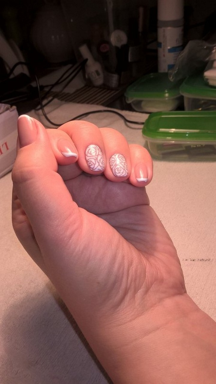 Для тех, кто не в теме. Это сначала на ногтевую пластину наносишь однотонное покрытие, как правило - телесного цвета. Потом рисуешь "усики" и "лунулы" другим цветом, например, красным или белым. "Усики" - это тончайшая цветная нить по краю ногтя, а "лунула" это возле кожи. Посмотрите на ноготь и вы её увидите - она обычно светлее. Вот на этом месте и обводишь цветом. И на одном-двум пальцах делаешь рисунок. На фото увидите. Также пробовал дизайны разные. Но, кроме среднего навыка, я вникал, каков «мой Клиент»?
