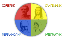 Развивая собственные взляды, Гиппократ выделил 4 типа темпераментов: ХОЛЕРИК,САНГВИНИК,ФЛЕГМАТИК,МЕЛАНХОЛИК,и ассоциировал их с 4 телесными жидкостями: КРОВЬ, ЧЕРНАЯ ЖЕЛЧЬ, ЖЕЛЧЬ И СЛИЗЬ.
